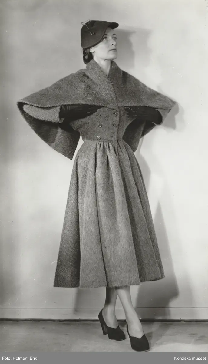 Modell i pälskappa med sjal, samt hatt och handskar. Från Madame Grès.