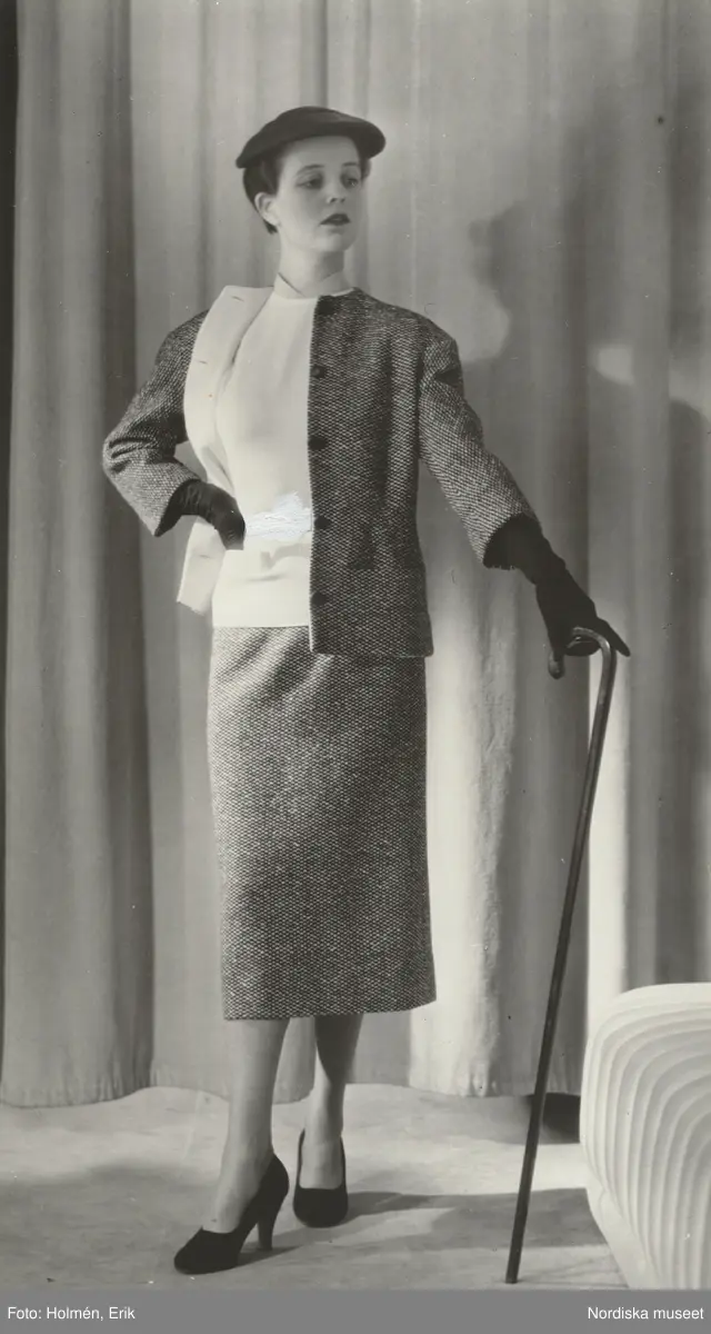 Modell i grå pennkjol och jacka, vit tröja, silverfärgat skärp, hatt och käpp i handen. Från M. de Rauch.