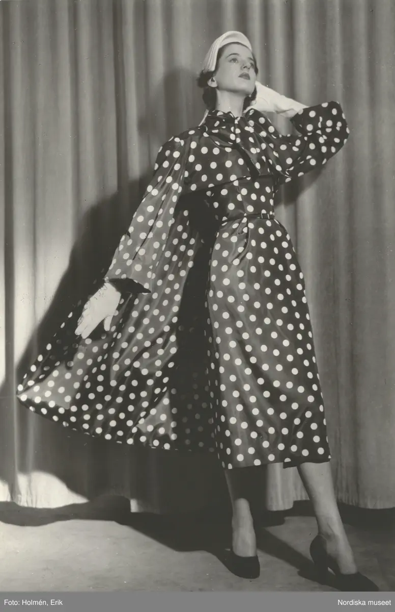 Modell i prickig klänning med släp, hatt och vita handskar. Från Manguin.