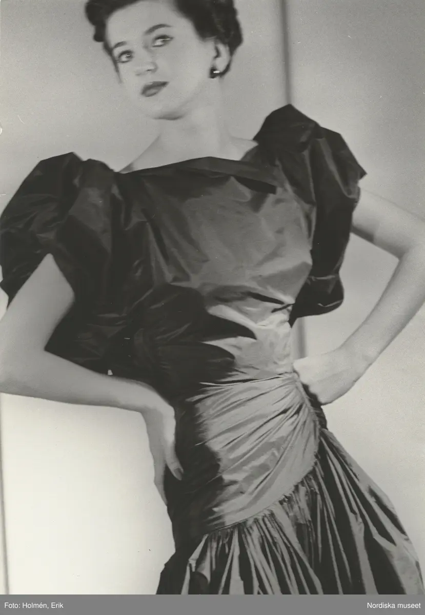 Modell i mörk aftonklänning med puffärmar. Från Madame Grès.
