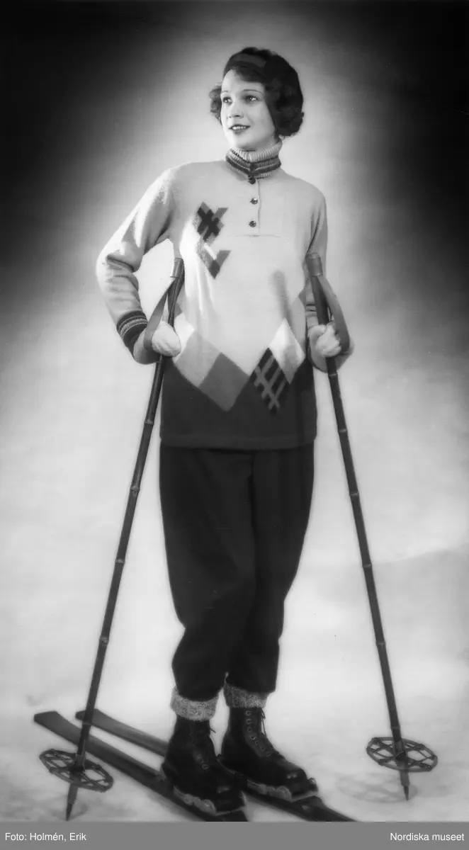Modell i skidkläder. Stickad tröja med knappar och rutor, mörka byxor, raggsockor, pjäxor, tumvantar och basker. Står på ett par skidor.
