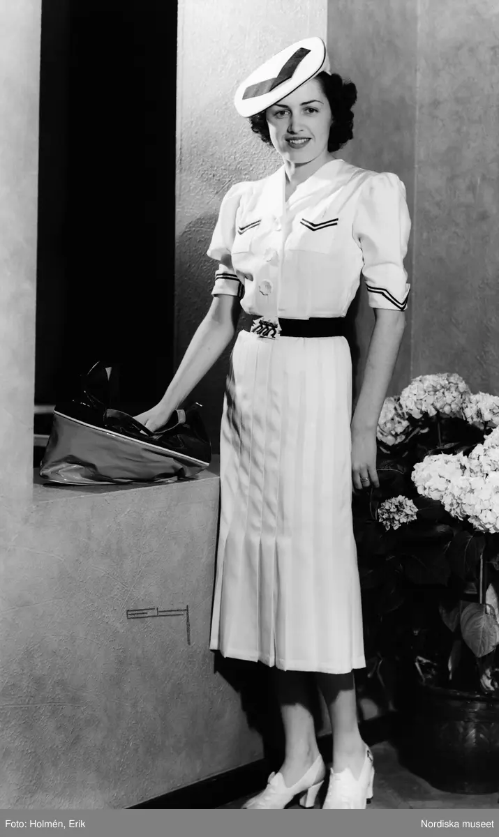 Modell i vit sjömansinspirerad klänning och hatt. Håller väska i handen. Hortensior i bakgrunden.