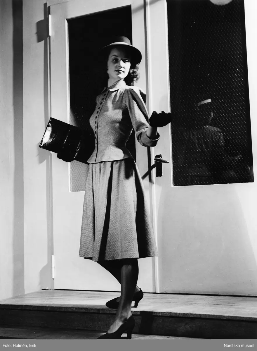 Stilfotografering. Modell klädd i dräkt, handskar, hatt, pumps och svart clutch. Står på en trappa framför vit dubbeldörr.