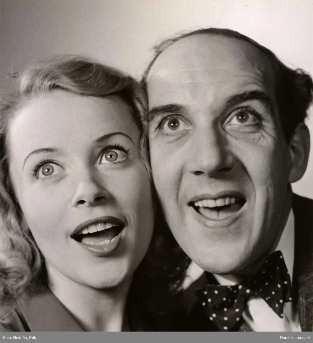 Reklamannons för Nordiska Kompaniets generalrea 1944. En man i kostym och fluga och en ung kvinna sedda framifrån, de står med huvudena tätt ihop.