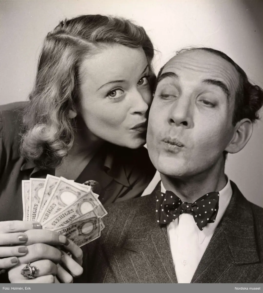 Reklamannons för Nordiska Kompaniets generalrea 1944. En man i kostym och fluga och en ung kvinna sedda framifrån, de står leende och håller en bunt sedlar tillsammans, hon kysser honom på kinden.
