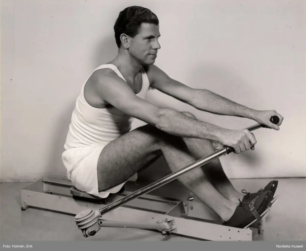 Sportavdelningen på varuhuset Nordiska Kompaniet i Stockholm 1944. En man i träningskläder, linne och kortbyxor och sportskor, tränar i en roddmaskin.