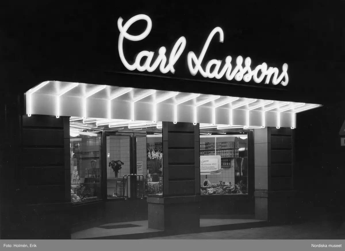 Carl Larsson, Karlavägen 87, Stockholm. Neonljus över entrén till matvaruaffär. Nordiska Kompaniet.