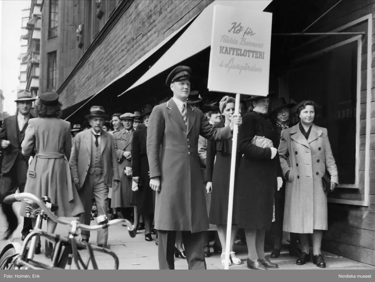 Kö vid försäljning av Rädda Barnens kaffelotter, Nordiska Kompaniet.