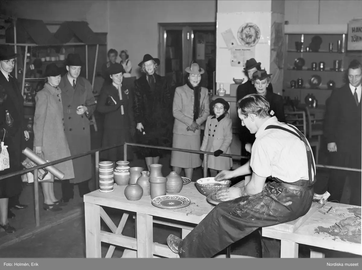 Utställning av skånskt och halländskt krukmakargods. Man tillverkar skålar och krukor i keramik inför publik. Nordiska Kompaniet.