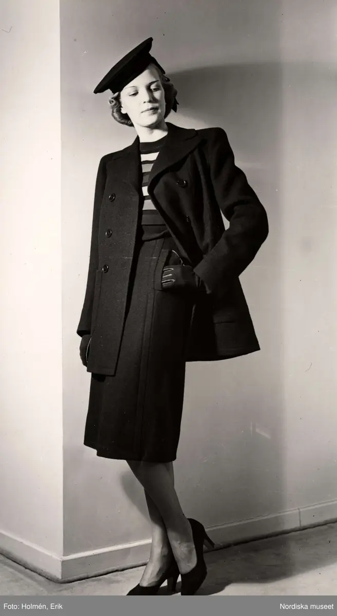Dammode, Nordiska Kompaniet. Modell i veckad kjol, tvärrandig jumper och trekvartslång jacka. På huvudet hatt.