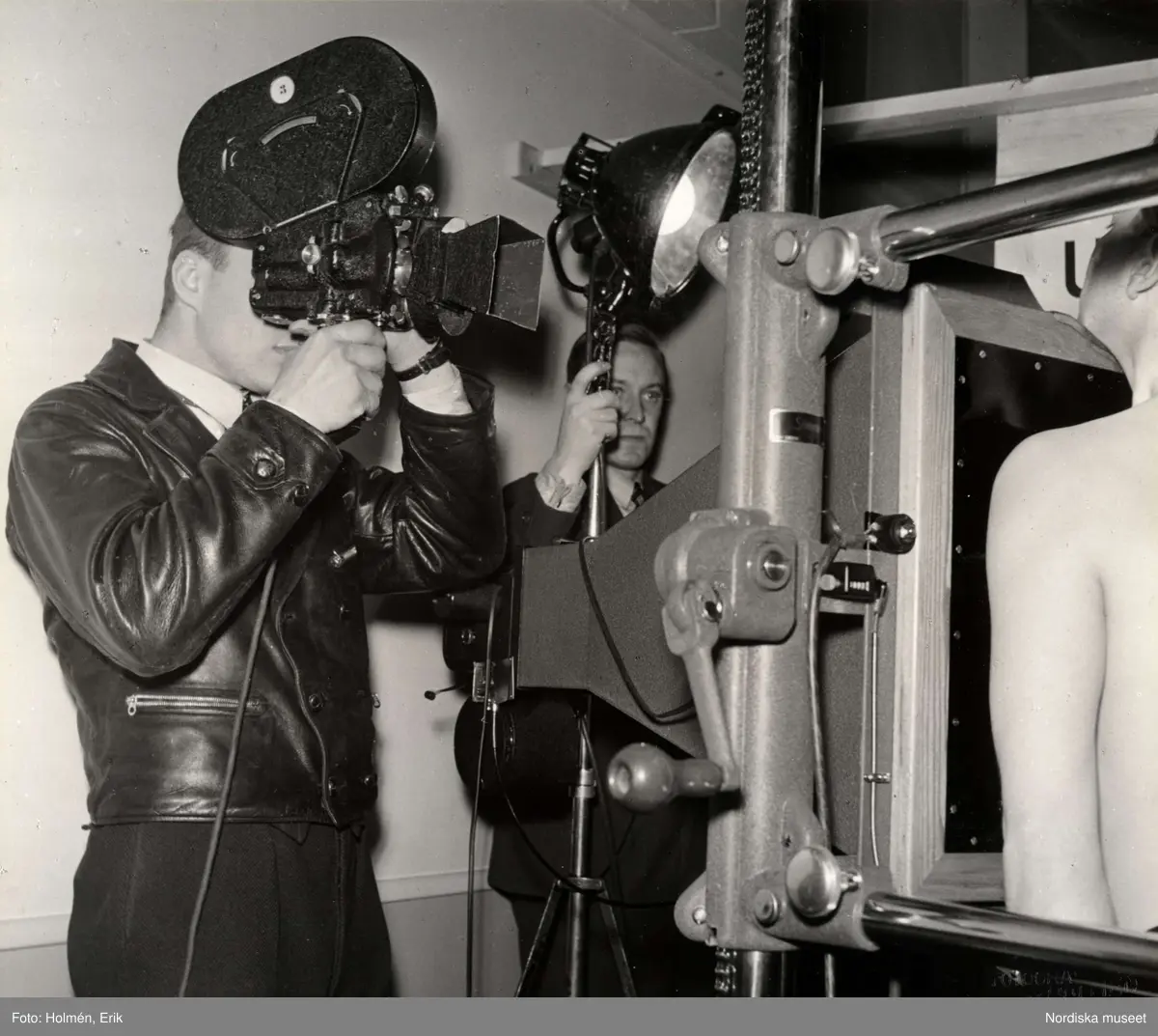 Skärmbildsfotografering på Nordiska Kompaniet 1943. En man i skinnjacka fotograferar, en annan man sköter belysningen och riktar en lampa mot en skärm, bakom vilken står en man med bar överkropp.