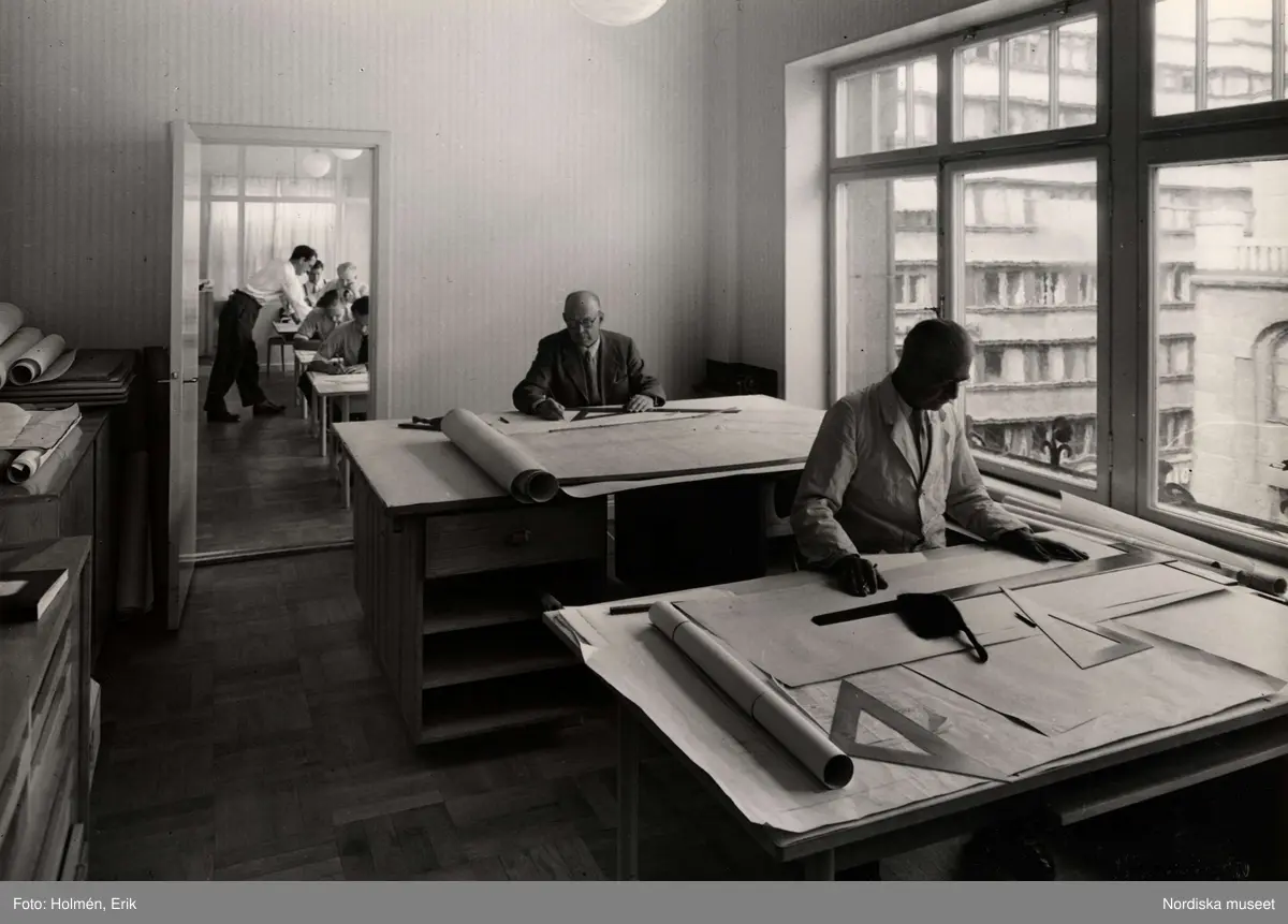 Inredningsavdelningens ritkontor på varuhuset Nordiska Kompaniet i Stockholm 1947. Två män sitter vid varsitt skrivbord och arbetar med ritningar. Ljuset faller in genom ett stort fönster. Bakom dem ser man genom en dörröppning in i ytterligare ett kontorsrum där skjortklädda män arbetar.