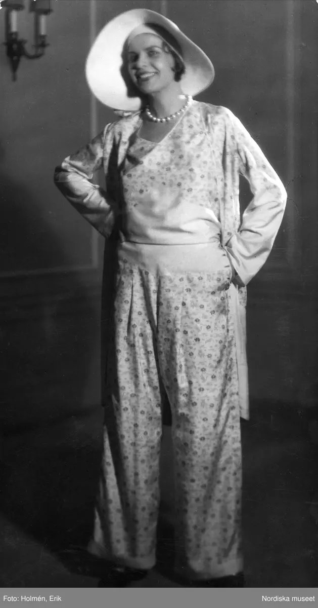 Modebild från Nordiska Kompaniet. Jean Patou. Modell klädd i vida byxor och lång överdel med småblommigt motiv, samt vit hatt och vitt pärlhalsband.