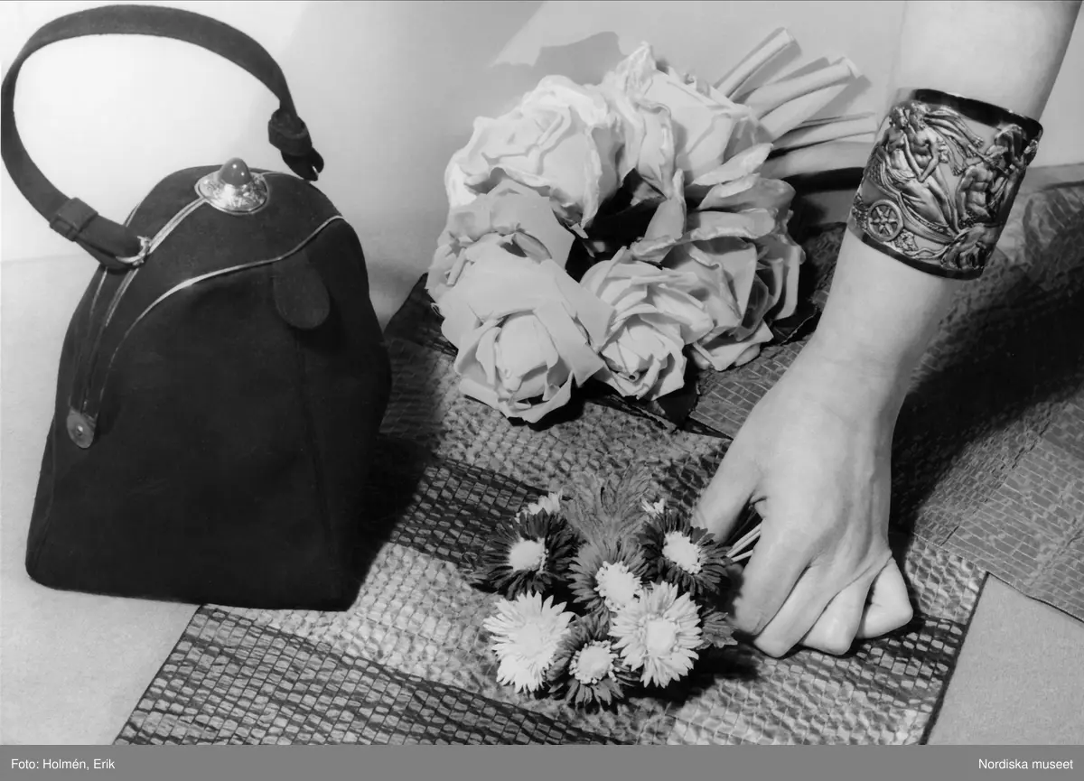Accessoarer från Nordiska Kompaniet. Huntingväska med guldbeslag. Fransk taftscarf i skarpa färger. Buketter; rosor i siden och sammet.