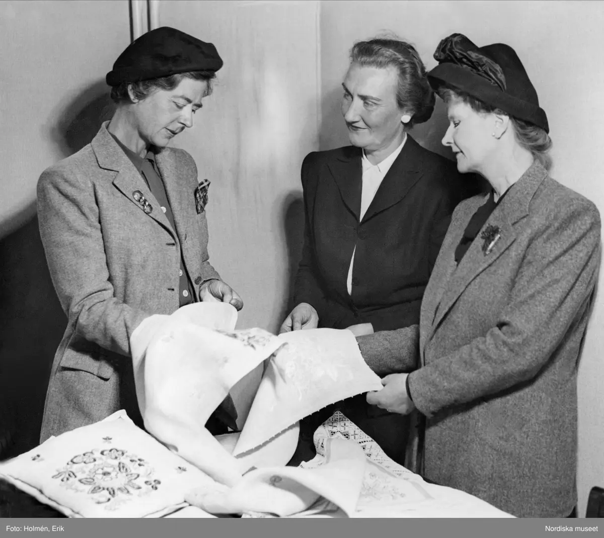 Juryn vid NKs handarbetstävlan 1945. Från höger: fd. statsrådinnan Günther, fröken Margit Risberg, fröken Greta Grahn.