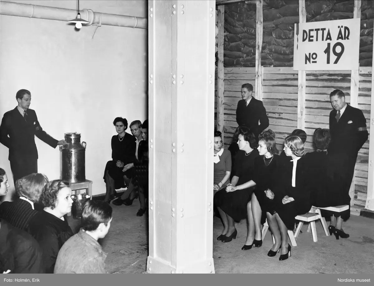 "Provsittning i luftskyddsrum No 19 under det stora generalrepet.Utrymmet är rikligt - både med tanke på disponibel golvyta och luftkub för varje besökare." Nordiska Kompaniet.