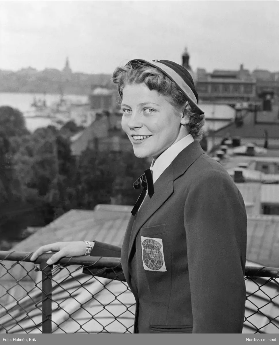 Porträtt av en kvinnlig deltagare i Sveriges OS-trupp på Nordiska Kompaniets tak