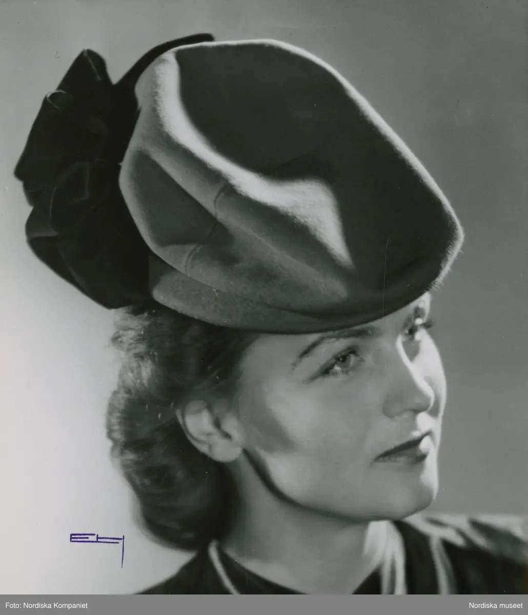 Modell i hatt. Mjukt formad kulle, rosett bak.