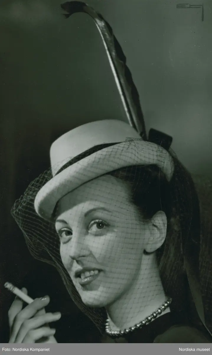 Modell i hatt med liten kulle och smalt, uppvikt brätte. Flor och fjäderdekoration. Modellen håller en cigarett i handen.