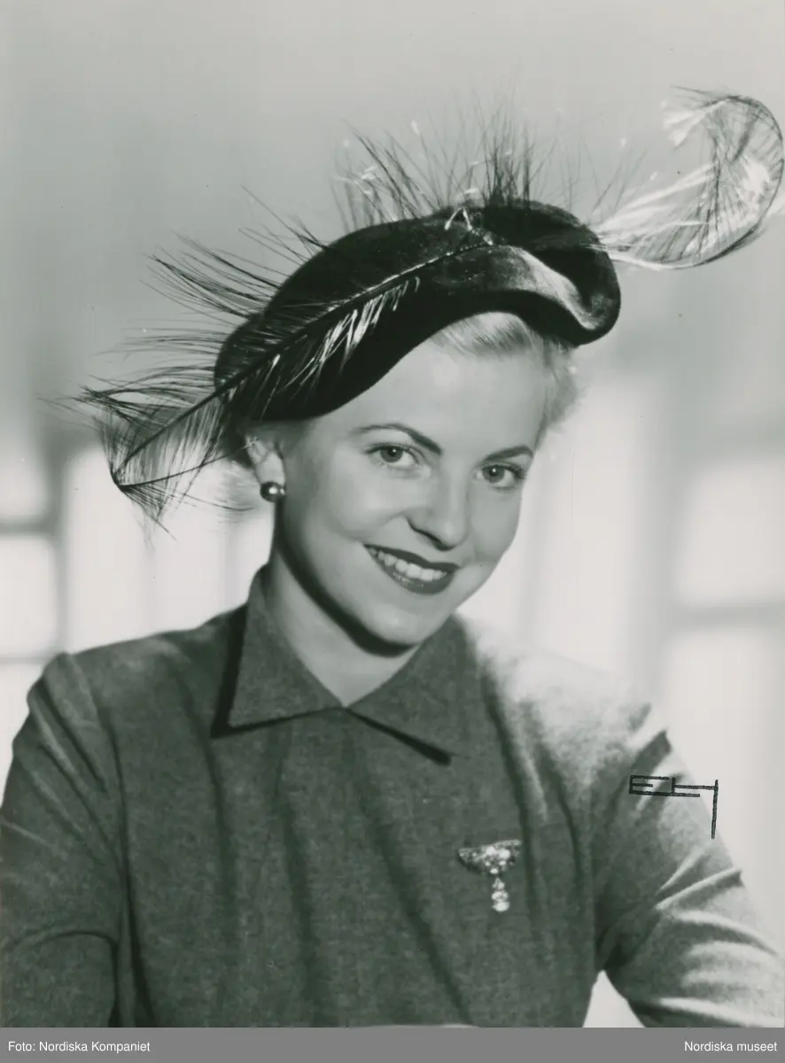 Porträtt av modell i hatt av svart velour med svarta strån, samt brosch och örhänge.