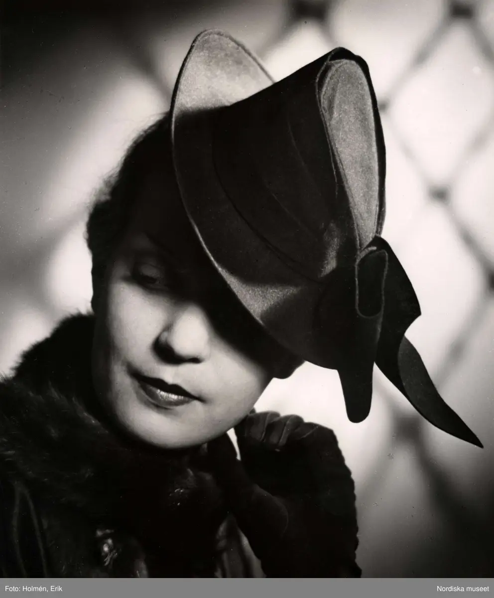Hattmode visas på Nordiska Kompaniet. Kvinnlig modell iklädd sportigt elegant hatt av jägarmodell med dekorrosett. Hon bär även päls med hög krage och handskar.