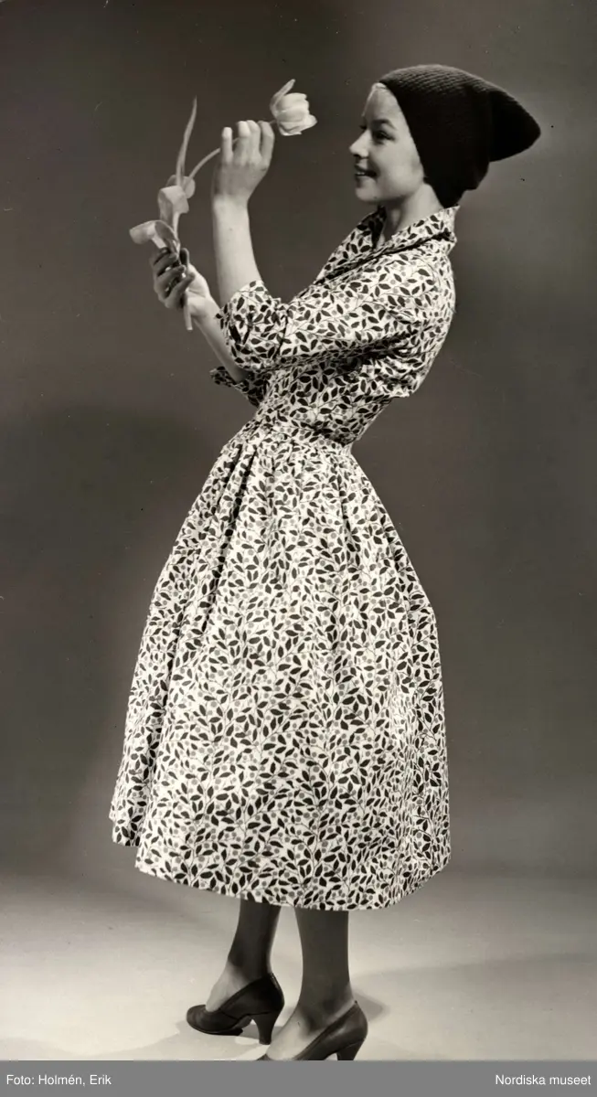Modell i mönstrad klänning och stickad mössa håller en blomma, en tulpan, i ett varsamt grepp. Från "Brud i Hem" på Nordiska Kompaniet.
