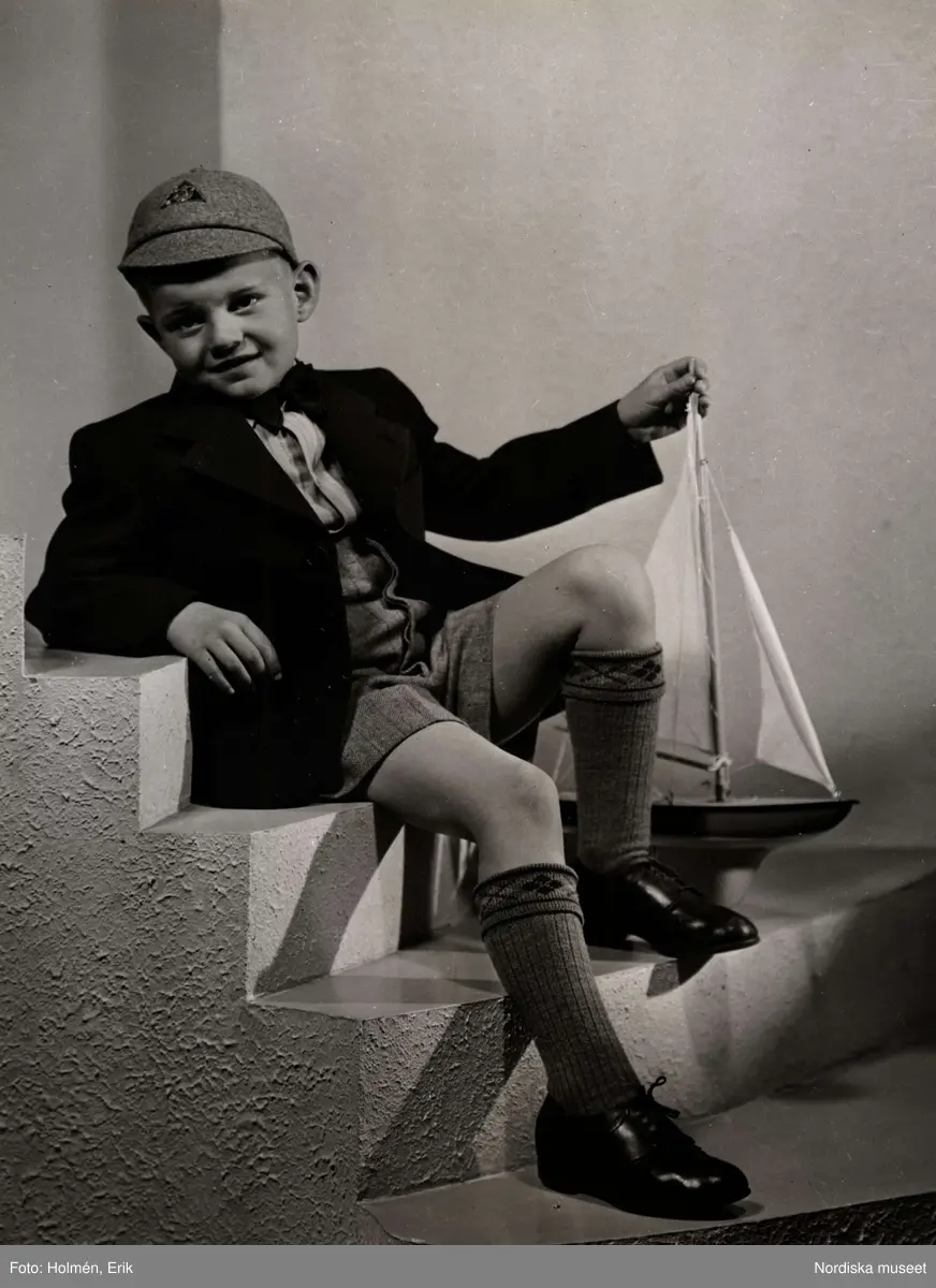 Barnkläder visas på Nordiska Kompaniet 1941. Pojke sitter i trappa iklädd kavaj och kortbyxor, knästrumpor, knytskor och keps. Han håller en segelbåt med ena handen.