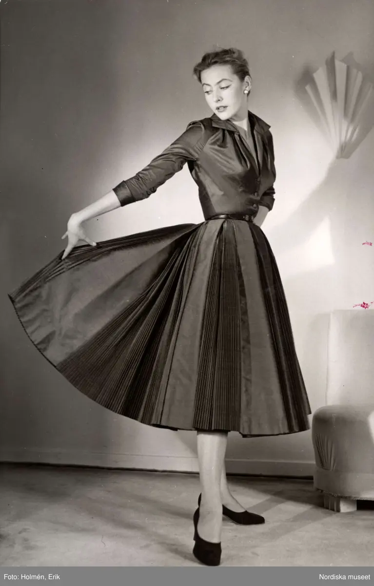 Kvinnlig modell visar en klänning från Christian Dior, september 1951. NK (Nordiska Kompaniet) Stockholm.