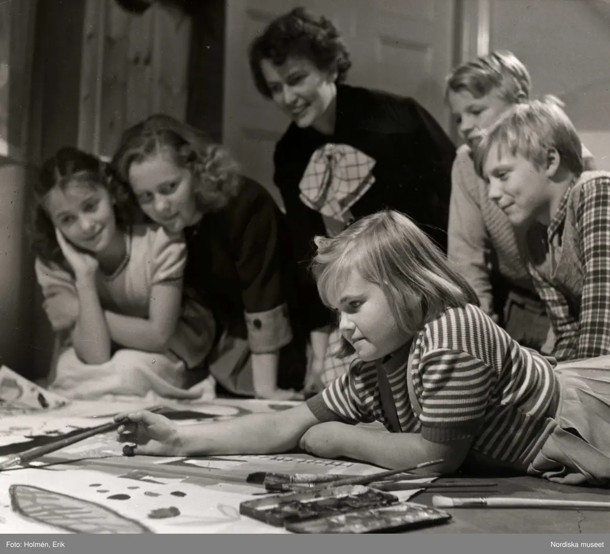 Flicka ligger på golvet och målar på stort papper. En kvinna och fyra andra barn sitter runt henne och tittar på. Barnens Värld oktober 1949.
