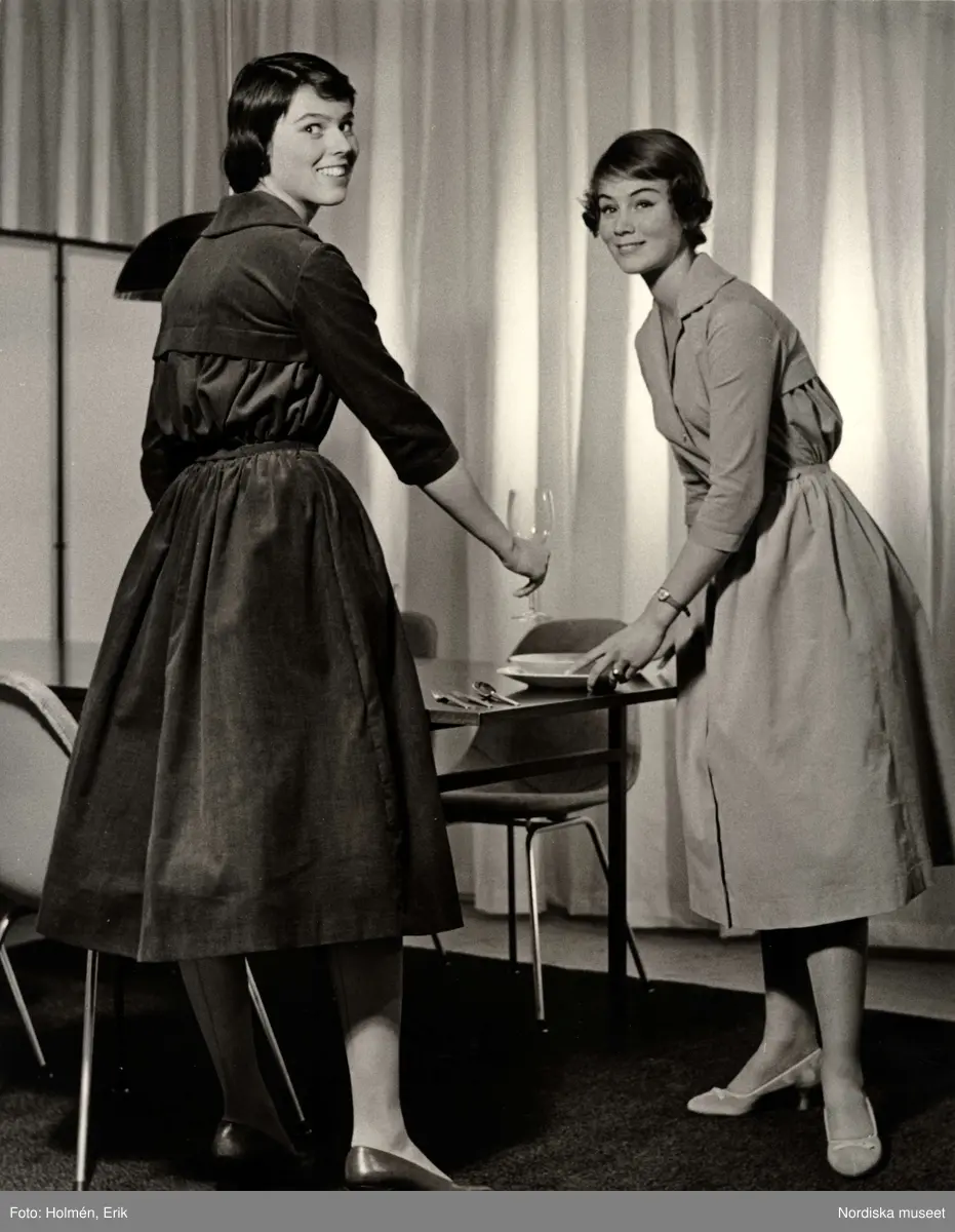 Dammode, klänning Salena-manchester, pris 89 kronor på NK (Nordiska Kompaniet) i Stockholm. Två modeller i samma typ av klänning.
