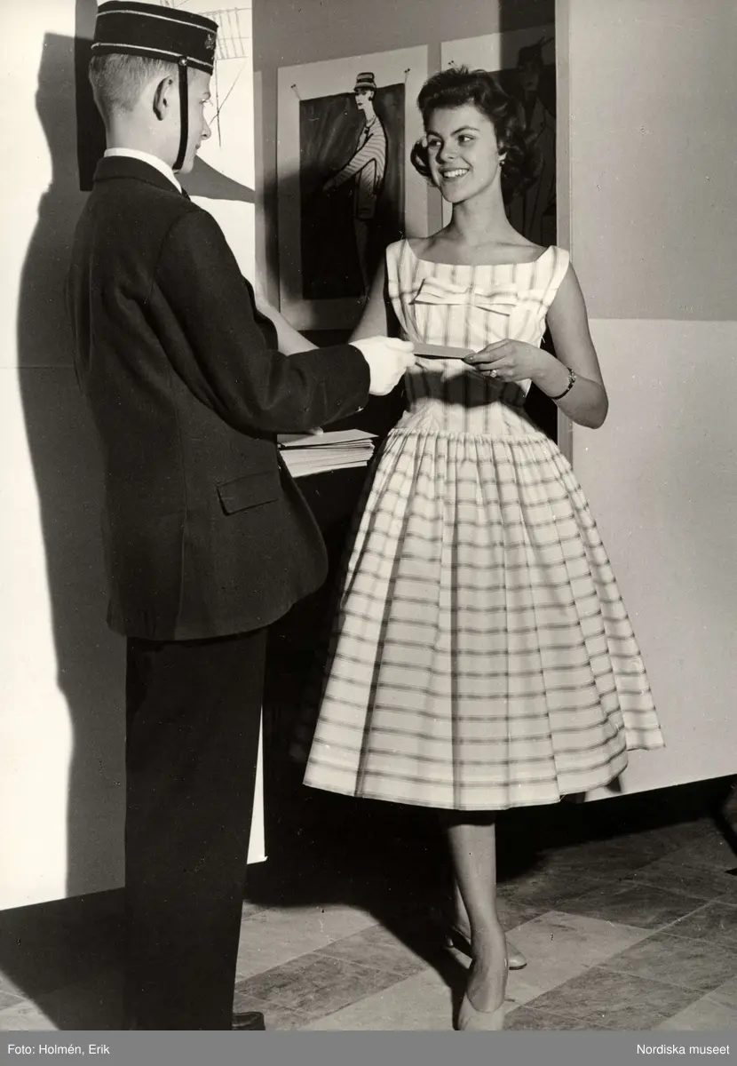 Piccolo räcker ung kvinna ett brev. Tonårsmode, Nordiska Kompaniet 1956.