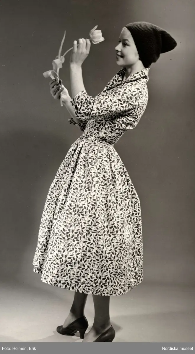 Modell iklädd mönstrad klänning och stickad mössa. NK (Nordiska Kompaniet) i Stockholm. Mölnlycke-tyg blåbär 1957.