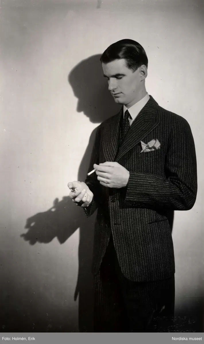 Nordiska Kompaniet, herrmode. Mörkrandig enkelknäppt kostym med väst, ljus skjorta, mörk slips med ljusa varierande kvadratiska och rektangulära mönster