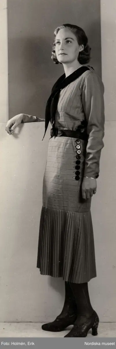 Dammode, Nordiska Kompaniet. Modeklänning från Viyella. Långärmad lång-klänning med rutstruktur i tyget, knäppöppning i sidan med stora knappar. Randigt tyg i volang nertill. Skärp i midjan och mörk scarfs runt halsen