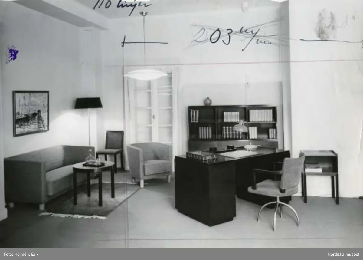 Utställningsinteriör från arbetsrum. Skrivbord, bokhylla, soffa och stolar. "Typenko" 1935.