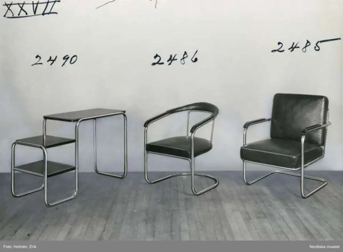 Stålrörsmöbler, bord, stolar med skinnsits och- ryggstöd. Nordiska Kompaniet.