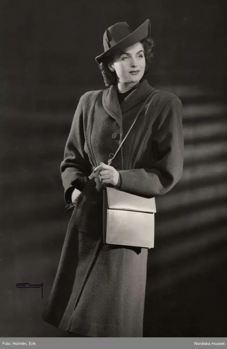 Nordiska Kompaniet. Fröken Hjördis Genberg iklädd hatt, kappa och väska.