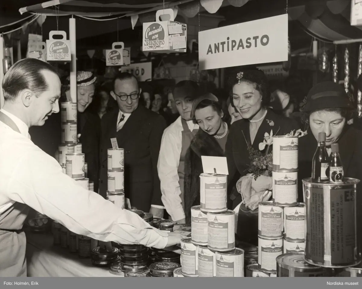 Försäljning av italienska produkter. Kunder framför försäljningsbord, manlig expedit i vit skjorta och förkläde. "Italiana" 1953 på NK (Nordiska Kompaniet) i Stockholm. Skylt "Antipasto".