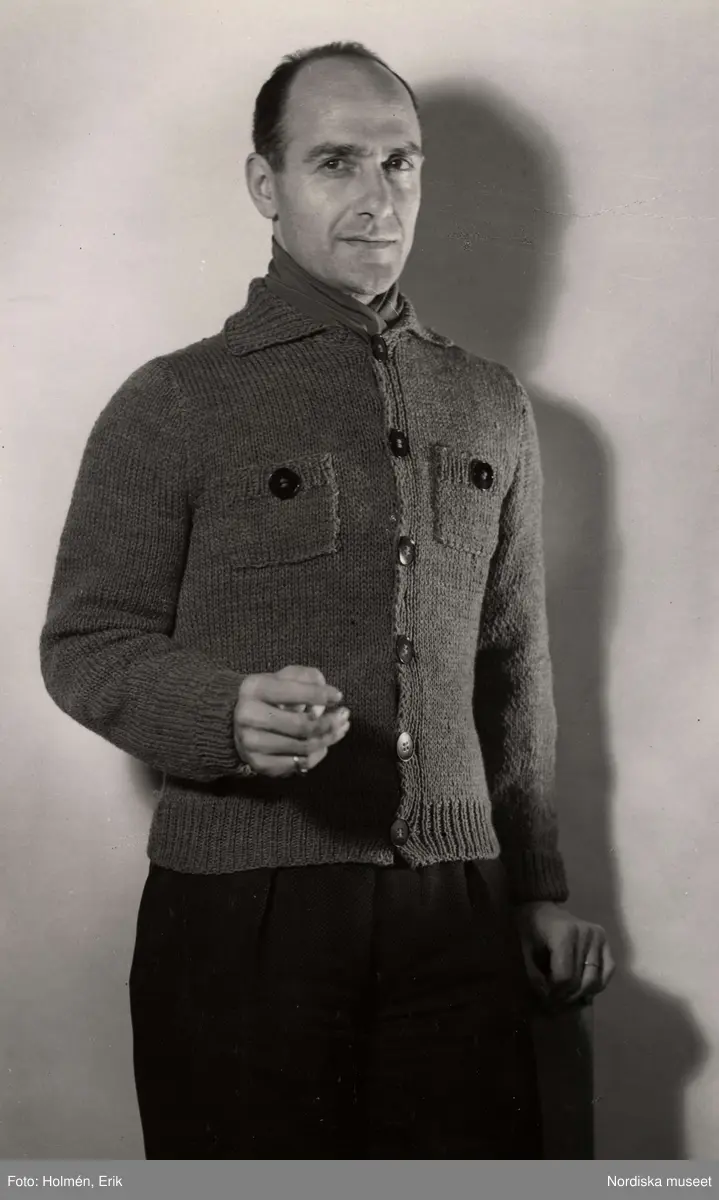 Herrmode. Man i mörka rutiga byxor, stickad kofta med stora knappar och en halsduk runt halsen. Nordiska Kompaniet.