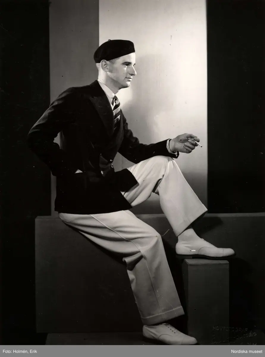 Nordiska Kompaniet. Herrmode, segelkläder. Man i mörk dubbelknäppt kavaj, ljusa byxor, randig slips och vita skor. En basker som huvudbonad.