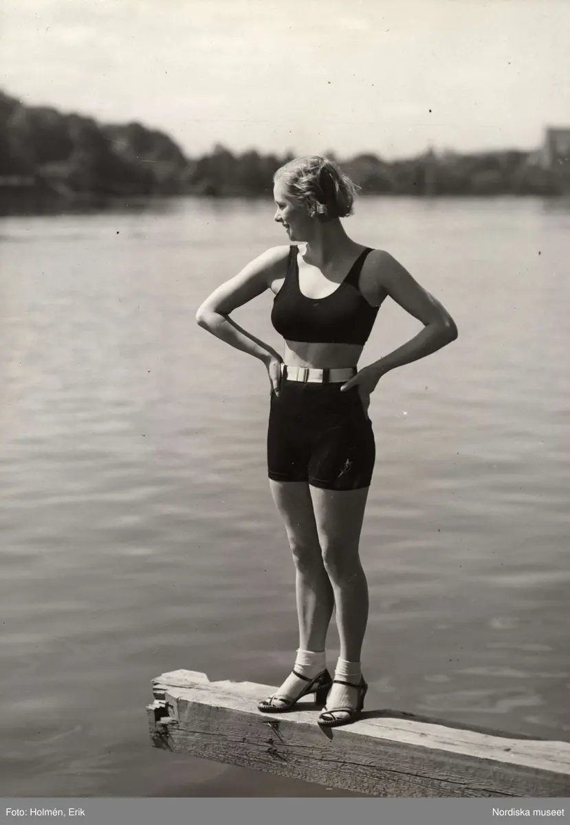 "Baddräktsuppvisning, Källhagen". Kvinna i tvådelad baddräkt, strumpor och skor vid vatten, Nordiska Kompaniet.