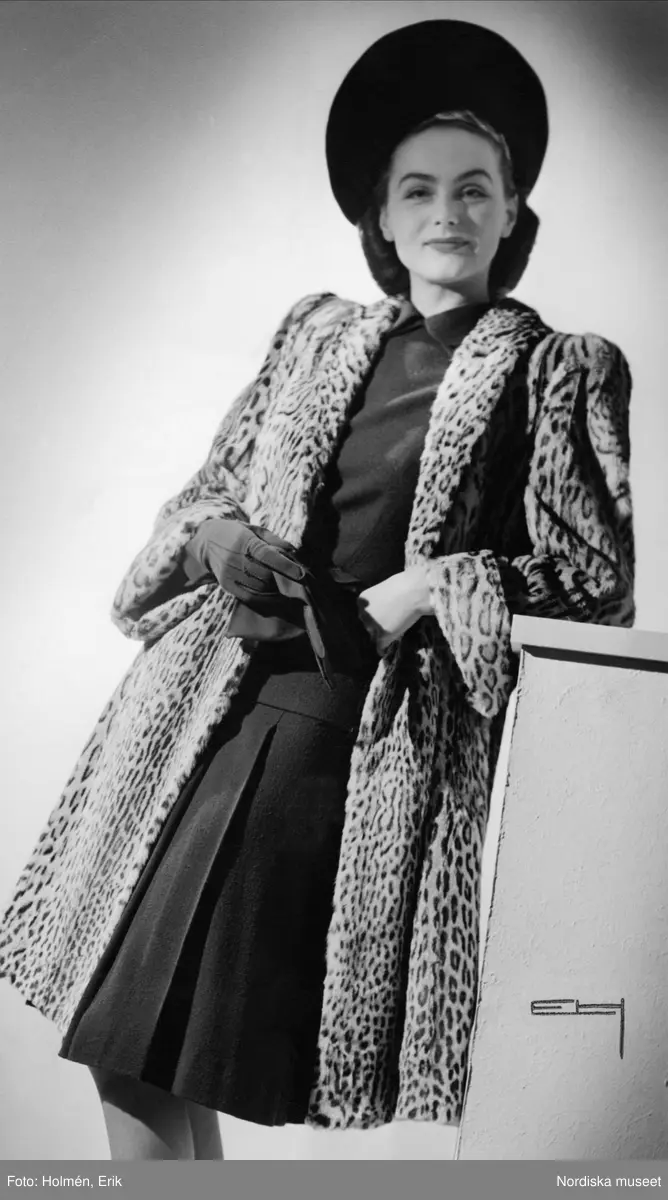 Modell poserar i en kort päls. Nordiska Kompaniet.