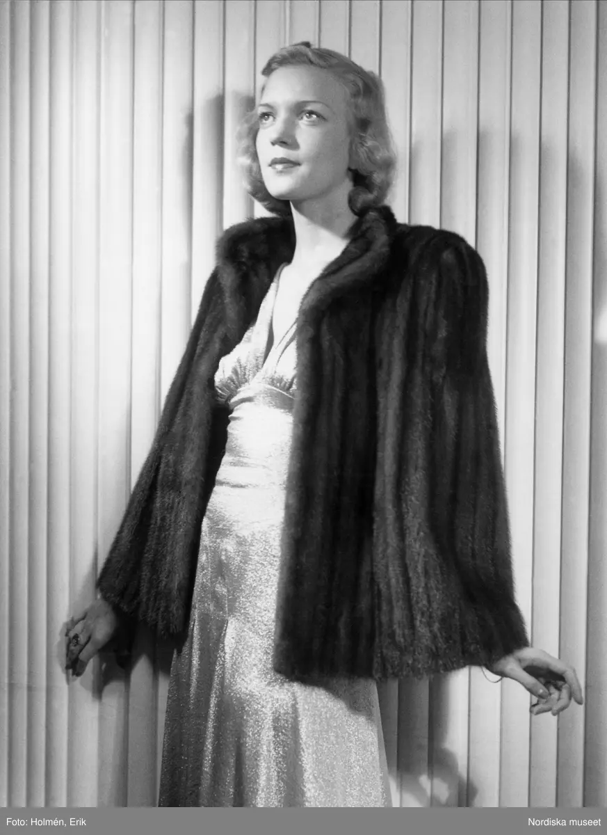 Modell som visar en pälsjacka. Nordiska Kompaniet.