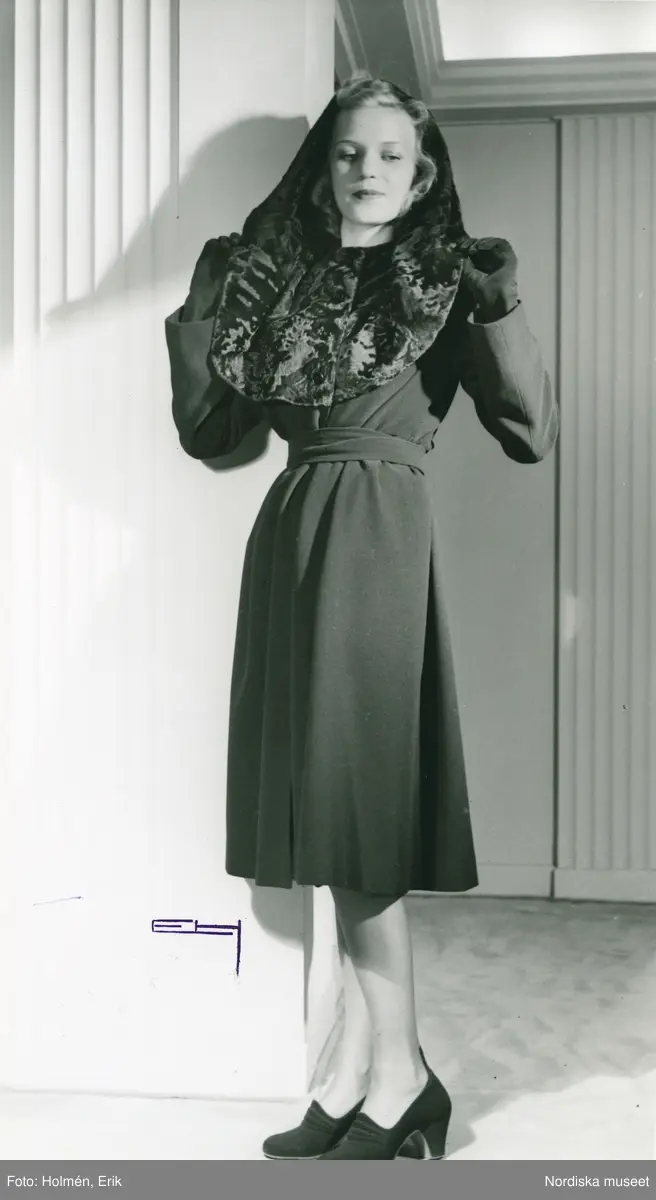 Helporträtt av kvinna i kappa med pälskrage över huvudet.