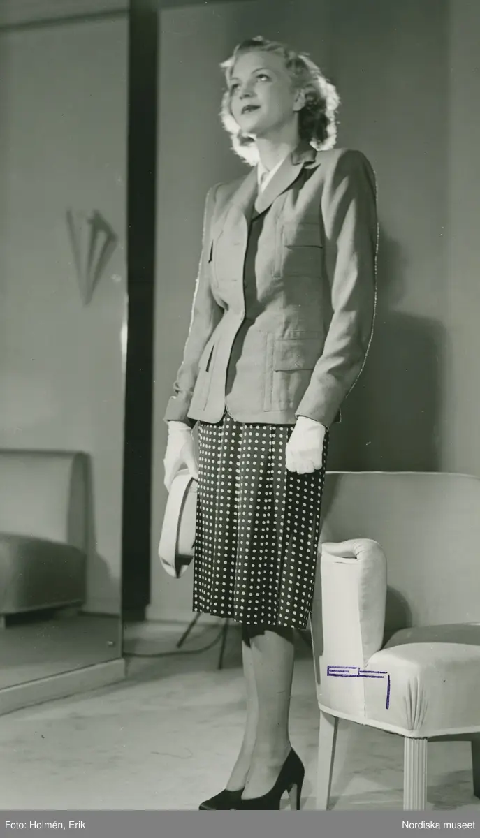 Helporträtt av kvinna i kjol, kavaj och pumps.