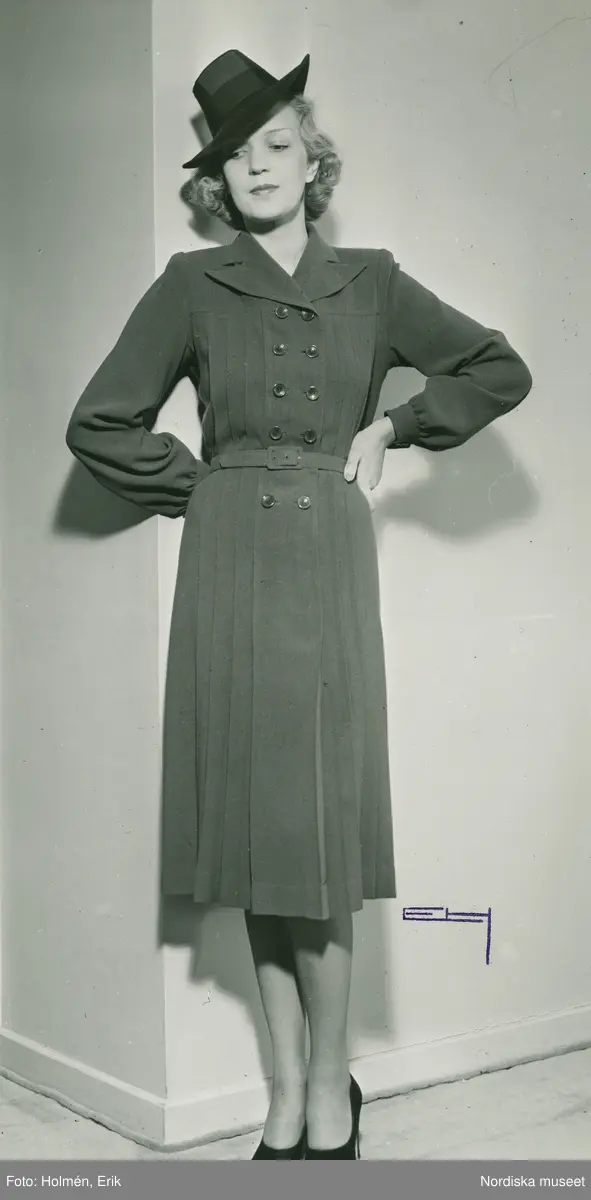 Helporträtt av kvinna i klänning, hatt och pumps.