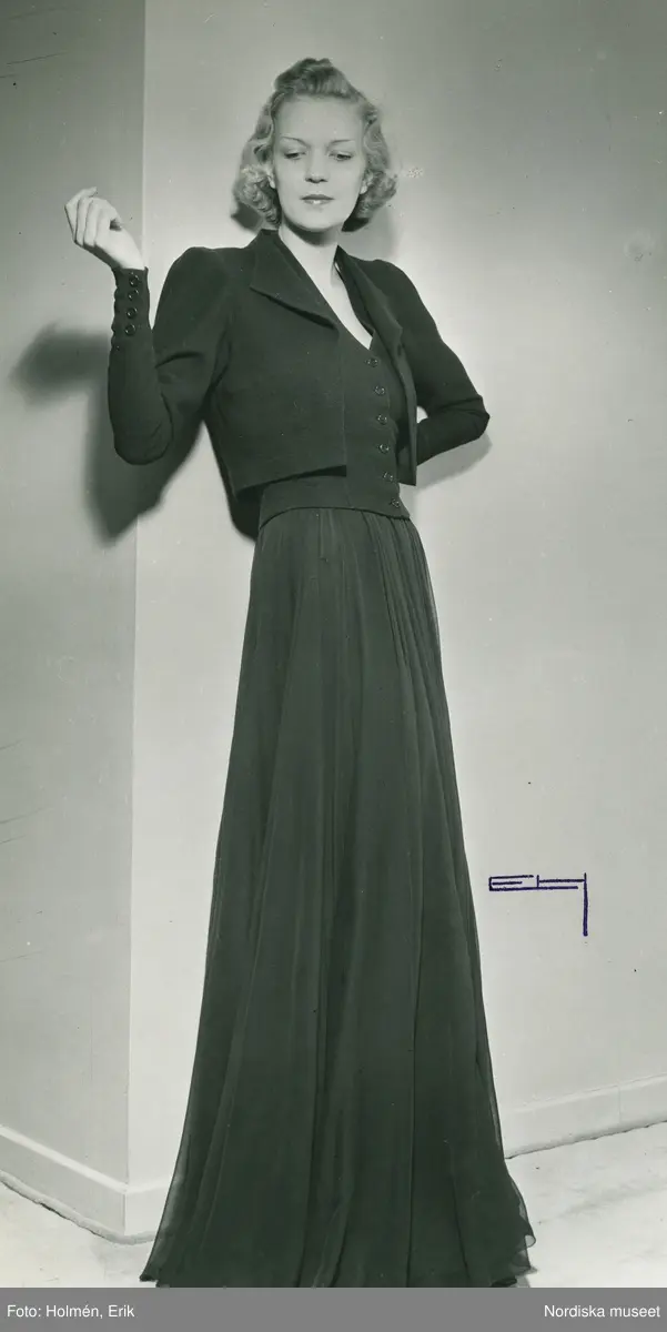 Helporträtt av kvinna i hellång klänning med kort jacka.
