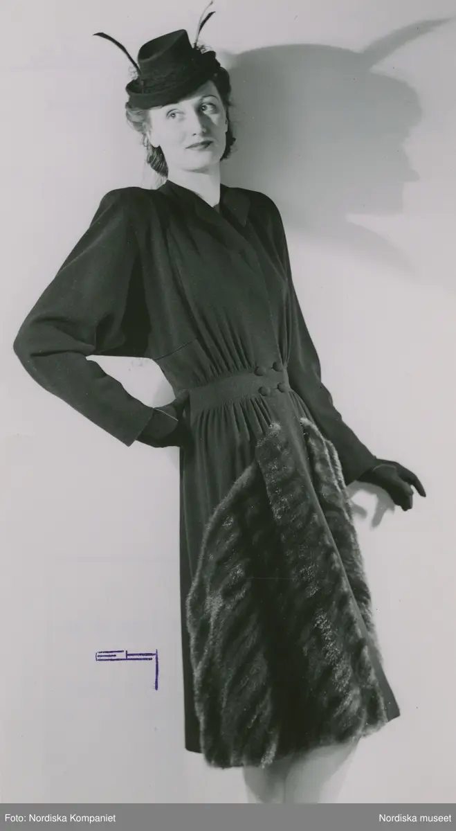 Modell i kappa av svart yllecrêpe och päls, handskar och hatt med flor och dekorband.