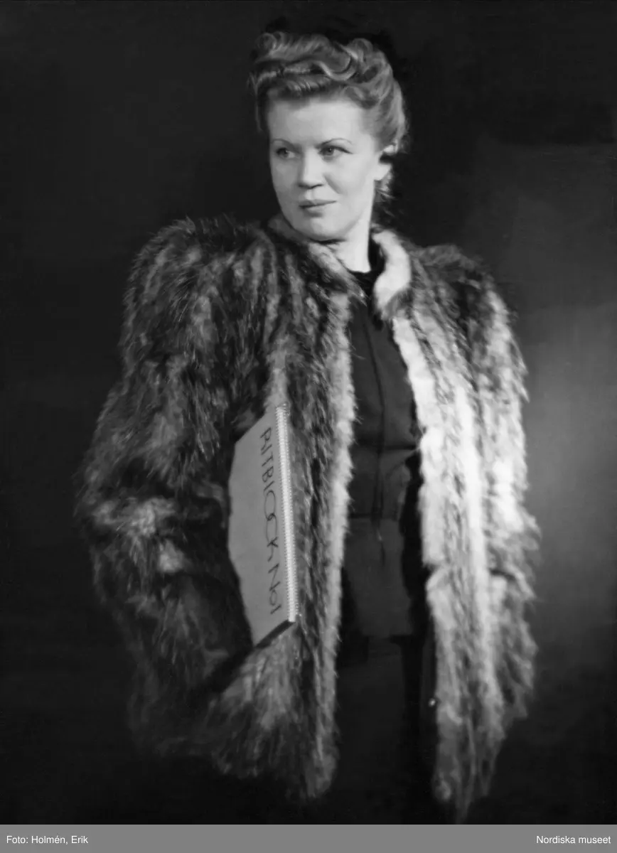 Astrid Sampe, chef för Nordiska Kompaniets textilkammare, poserar i en pälsjacka.