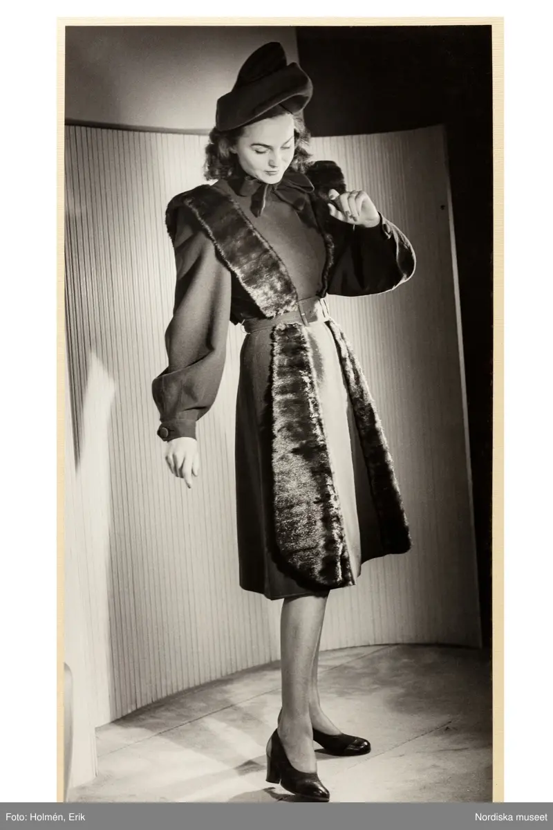 Mannekäng poserar iklädd kappa, hatt och lågklackade pumps. Kappan har vid ärm med manschett, skärp i midjan och pälsdekor. NK:s Franska damskrädderi.